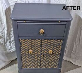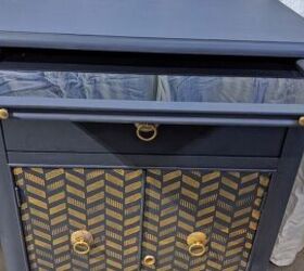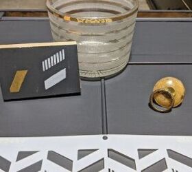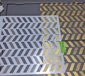 I wanted to give it an art deco vibe, with a modern flair. I went on amazon and found a striped herringbone stencil that I ordered, as well as stencil brushes. I hemmed and hawed about whether I should use light grey or gold for the stencil pattern. But after laying all the elements out together…the choice was obvious. Go for the gold!