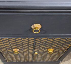 The gold is a paint I had picked up at a thrift store for $2 last year and have used many times. But there was more than enough left for this project. With the cabinet laid on it’s back, I centered the stencil between the two doors and worked my way left and right, then up and down.