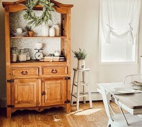 I recently purchased a used armoire for $50. It had a huge hole in the back; probably for a TV at one time. I wanted to use it as a hutch. I removed the top doors, and created a pretty diy background.