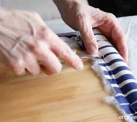 The foam and batting I had used before were fine so I kept that as is, but this time I went with a more natural neutral fabric. I actually used inexpensive rugs from IKEA (SORTSO - $4) - they were just big enough to cover the seat and I liked the texture with the stripes. I probably should have washed them to take out the folds but my hand held steamer did the job very well.
