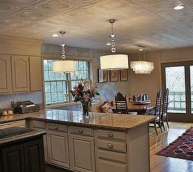 Our new house came complete with popcorn ceilings in every room. We were looking for an inexpensive way to update the ceilings. When we removed the soffits from the cabinets, it left big holes in the ceiling. It would have been very expensive to patch the holes, scrape the popcorn, skim coat and paint the ceiling. The solution? We found these glue up styrofoam tiles .They glued right up, were easy to cut with an exacto knife and added architectural interest to the ceiling. The product cost us around $400 for the kitchen. We get a ton of compliments. You can read more details of our kitchen makeover on our blog.