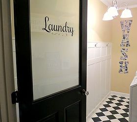 We took our boring laundry room and made it charming by adding cabinets and crown molding, painting the linoleum floors, building a half table for a workspace, adding shelves, hanging board and batten, and adding a fancy door.