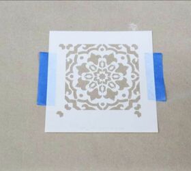 Apply repositionable spray adhesive on the back of your tile stencil. This will reduce your chances of paint seepage or “bleed” underneath your tile stencil. Add two pieces of low tack painters tape to two sides of your stencil to make sure it doesn’t shift or fall off while stenciling.