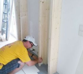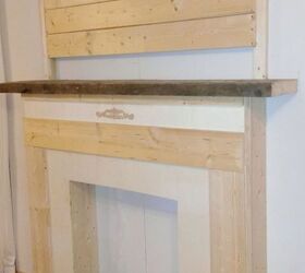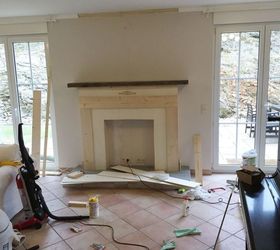 Once we tiled the area we used clamps until the glue dried. We framed out about the mantel and created a shiplap look so later a tv could be hung and the cords could e dropped behind.