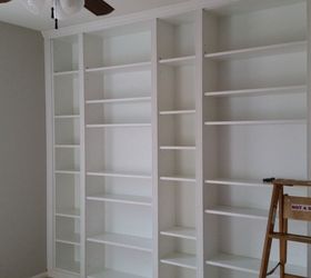 The 4th day I was off. I secured them to the wall. I started in the center of the wall with the middle piece and used the "L" brackets that came with the units. I had to do on the side as there was no room to work with above the bookcases.