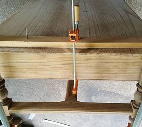 It had been raining all week and I took advantage of the humidity and glued and clamped the top to the base back together again, using a board to pull it into a straight line. Left it to dry overnight.