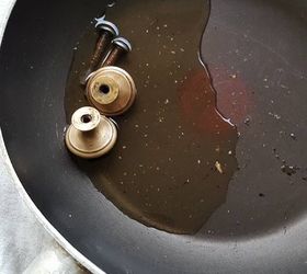 The knobs that came with the table were dirty, and needed to be cleaned. I tried Brasso, but it wasn't working easily enough. I tossed the knobs into an old pan and added vinegar. Heated up and allowed them to boil for a couple minutes.