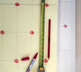 Create a grid and carefully measure it out on both the foam and the chipboard lid. We used a grid of 4 buttons over the length of the lid, and 3 buttons across.