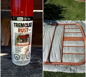 I wanted my bench to pop so I am using Tremclad rust paint in Fire Red gloss. I laid my headboard on a piece of plastic and began spraying. I ended up doing two coats on each side. Letting dry completely between coats. Repeated steps for the two cut pieces.