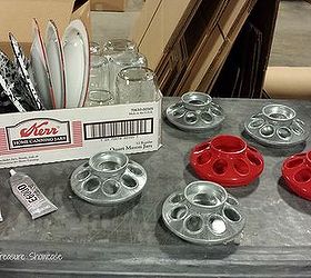 Screwed the jars on to the poultry feeder bases ~ the red are plastic the metal are galvanized I did end up painting a few of these no real reason I just wanted to mix things up :)