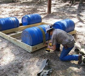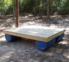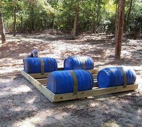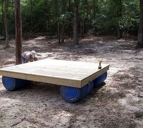 Wow! They need a "love" icon for your photo! I love the color of your alls water! We have the tea or coffee colored water from all the tannic acid of the hardwoods. If'n you have four barrels, make a deck! or, like one of the folk out there thought, perhaps a pier, you know, two posts sunk in the ground at the waters edge, and lengths of 2 X 6's with 4 foot decking (the walkway) supported with a barrel at each end, tied to those posts. Shoot, you could make a really long pier, since these barrels hold up a lot of weight.....hmmmm, sounds like another project.....whatever you do, post it! I'd love to see!