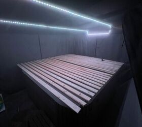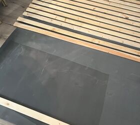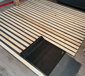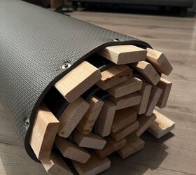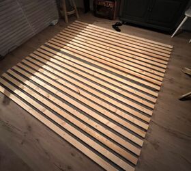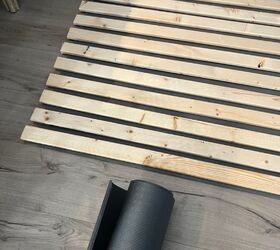 After laying bath mats out, we spread out the wood. For 8’x8’ we used 24 slats and eyeballed the gaps in between.