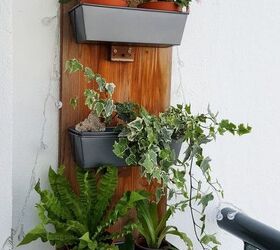First I cut some windows into the slates of the cabinet door. Then I took some recycled wood and fashioned a shallow shelving. Attached the door to the shelving units and voila I have a vertical planter!