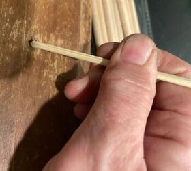 I insert the dowel, or skewer if hole is too small for a thin dowel, mark where it hits the front of the surface of drawer front, remove it and then use a pair of diagonal cutters to cut the wood “ plug” to size. I then roll the plug into my homemade wood filler and reinsert the home made plug into the previously drilled hole.