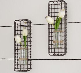 Tie jute around small jars and attach to the wire basket, then fill with faux or real flowers. Get tutorial here
