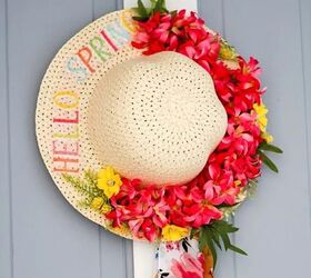 Decorate a straw hat with bright colorful florals for pretty front door decor. Get tutorial here