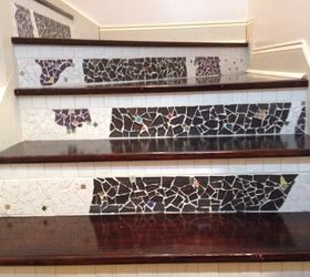 Tenth step was grouting. I don’t like TO grout, but I love the results! It creates such a finished look to most mosaic projects and it hides a lot of mistakes. Starting at the top of the stairs, we hand-grouted each riser strip with premixed off-white grout according to directions on the bucket. Tip: Some premixed grout has a resin in it that it very hard to remove when dry. Be sure to wipe your grouted tiles with a clean wet sponge until you can't see a hazy surface. We didn’t wipe it down quite enough and had a devil of a time getting it nice and clean after it dried. Once again, it was proven that covering the stairs with the plastic was worth the trouble. Grout is messy! Check out the finished stairs!