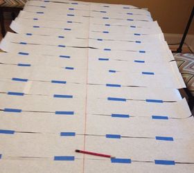 Third step was to measure the width and length of each step (yes, they vary somewhat to accommodate the landing and the turn in the staircase). We cut strips of white paper to fit each riser and numbered them. Then we laid out all the strips and taped them edge to edge to make one long piece of paper.