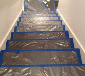 Seventh step. I was bound and determined that those beautiful hardwood treads would be protected, so we used heavy duty plastic and LOTS of tape to cover all the treads. This was a labor intensive step, but I would never have skipped it. Dried thinset and/or grout is not pretty on wood and it hard to get off.