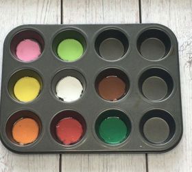 Next, you'll mix up your colors! I used Elmer's clear school glue, acrylic paint and a cupcake tin. This was the easiest way to keep the paints from mixing. I used about 2 tablespoons of clear glue to 1 teaspoon of paint. Be sure to mix this well.