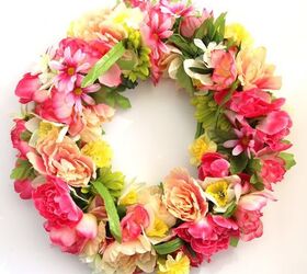 Pick up flowers from the Dollar Tree, and bend a wire hanger round for the wreath form. Get tutorial here