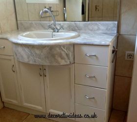 Roll on a basecoat, cover grip lines the color of your grout, and create several “squigglies” with black paint for the marble. Get tutorial here